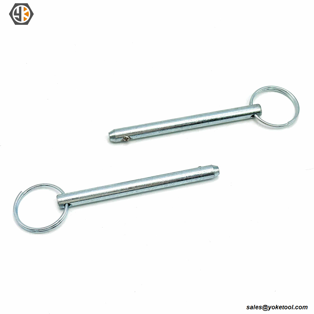 Los pasadores de retención de Yokelink están diseñados para usarse en operaciones temporales de desconexión rápida. Se utiliza como una forma conveniente de ajustar o quitar accesorios del equipo. El pasador tiene un rodamiento de bolas en un extremo con un resorte de acero que deprime y sale para bloquear el pasador en su lugar. Los procedimientos rígidos de control de calidad garantizan un sujetador consistente en el que puede confiar. Los tamaños estándar están hechos de acero con bajo contenido de carbono, galvanizado o acero inoxidable.